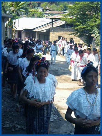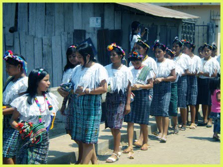 Estudiantes durante la entrada de flores con el traje típico de Jacaltenango. En la imagen se puede apreciar la cinta para recoger el cabello, el güipil blanco y el corte de diversos colores